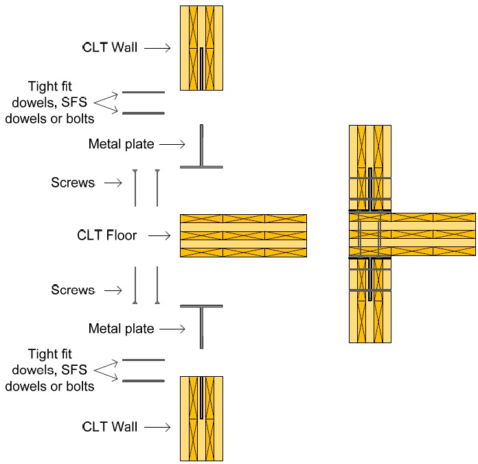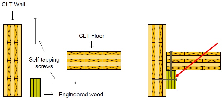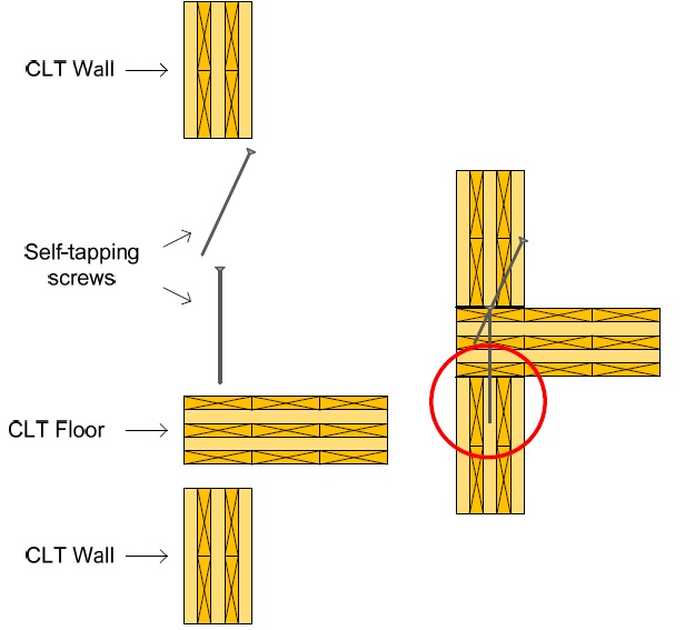 CLT wall can be connected to CLT roof or to the next floor in its simplest method by drilling self-tapping screws through them; first drill the CLT floor to the wall in the lower floor and then drill the wall in the upper floor to the CLT floor. When driving screw on edge, should pay more attention as they may penetrate through end grain.