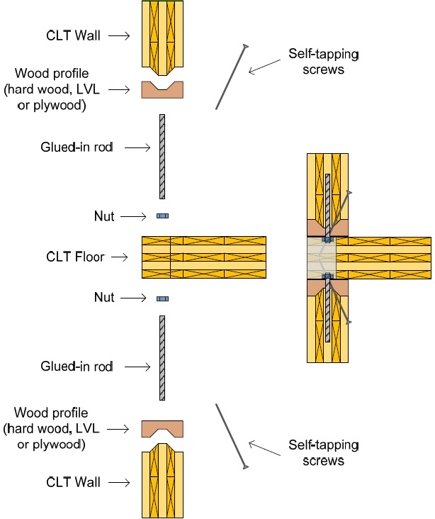 In a brief explanation, this connection system done by gluing rods in both upper and lower walls and screwing these rods to the CLT floor through a nut and finally drive self-tapping screws from top and bottom to tighten the lower and upper wall to the CLT floor.